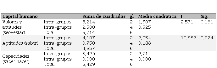 Esto, sin duda, fortalece las ventajas competitivas de la organización y sirven como base para el desarrollo de otras capacidades (Martín et al., 2009). Sin embargo, como señala Tejedo (2016), es fundamental tener claro que, al ser habilidades desarrolladas por los individuos dentro de la organización, estas se van con ellos una vez abandonen la empresa y que en muchos casos les terminan siendo útiles y válidas como experiencia frente a otra oportunidad laboral. En suma, se presenta a continuación en la Tabla 2, los resultados de varianzas de un factor, donde se han establecido las variables dependientes al capital humano de acuerdo a los planteamientos realizados en esta investigación.