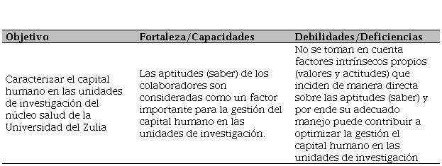 Tomando en consideración los resultados obtenidos, seguidamente se establecen estrategias para la gestión del capital humano en las unidades de investigación del núcleo salud de la Universidad del Zulia. El paso previo para esto fue el desarrollo de una base diagnóstica de fortalezas/capacidades y debilidades/deficiencias, elementos que resultan determinantes para tomar decisiones y alcanzar el éxito esperado (Martínez-Garcés, 2016); la misma se presenta en el Cuadro 2.
