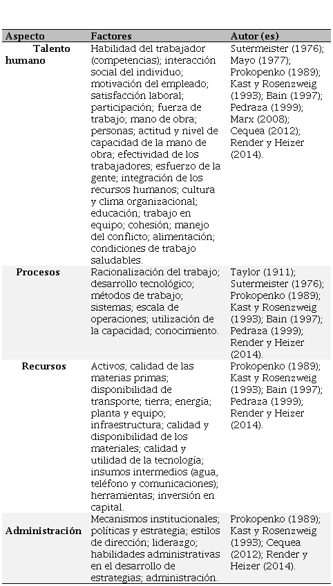 Son muchos los autores que han tratado de establecer los factores que influyen en la productividad; desde los economistas clásicos hasta los teóricos contemporáneos de la administración y de las operaciones. En el Cuadro 1, se presenta un resumen que agrupa los factores hallados.