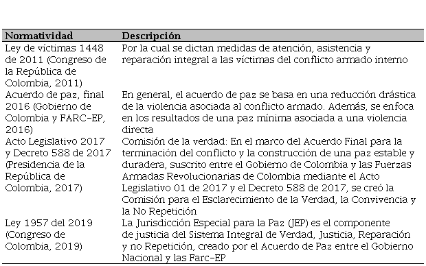 Cabe resaltar que los sujetos que participan en la presente investigación, son personas víctimas del conflicto armado que hacen parte de los procesos organizativos, emprendimientos y en las dinámicas de empleabilidad del departamento de Cauca; en este sentido, se presenta a continuación en el Cuadro 2, el marco normativo colombiano que atañe a los propósitos de esta investigación y que están presentes en los relatos de los entrevistados.