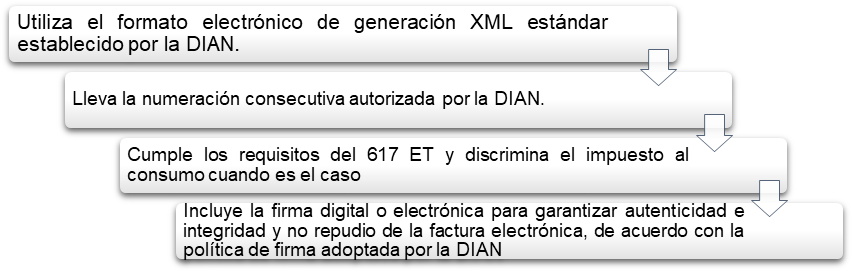 En cuanto a la automatización de los procesos, se ha detectado a través de las encuestas que el personal gerencial está orientado al cumplimiento de lo establecido en la facturación electrónica, es decir que cada empresa que deba expedir factura electrónica debe cumplir con las siguientes características, en concepto de la DIAN (2019), las cuales se muestran en la Figura I.