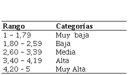 En otras consideraciones, el análisis de los datos se hizo a través de la estadística descriptiva, los mismos fueron procesados a partir del siguiente baremo que se muestra en el Cuadro 1, utilizando como base las puntuaciones empleadas en la escala, la cual va de 1 a 5, ubicándose así los rangos de las categorías en muy baja, baja, medio, alta y muy alta; de esta forma se sustentan las tendencias de la información recolectada.