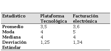En este sentido, la Tabla 1 permite observar las estadísticas descriptivas con respecto a las dimensiones incluidas en el comercio electrónico, los dos elementos presentan una media de respuestas de 3,5 y 3,6; en cuanto a la moda, la plataforma tecnológica se ubicó en 4, para la facturación electrónica fue de 5. La mediana, se situó en 4 para ambas dimensiones, entendida como el dato que divide la distribución en partes iguales; finalmente, la desviación estándar fue la medida que tuvo variación asumiendo 1,25, para la primera dimensión, y 1,34 para la segunda, ello refiere la dispersión con respecto al promedio.