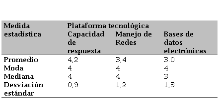 En cuanto a la mediana, los dos primeros elementos asumieron un valor de 4; no obstante, el referido a las bases de datos electrónicas asumió la categoría 3; con respecto a la desviación estándar, la capacidad de respuesta fue de 0,9, el elemento manejo de Redes 1,2, mientras el de Bases de datos electrónicas 1,3 (ver Tabla 2).