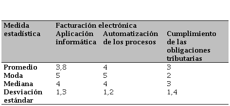 De igual manera, la Tabla 3 incluye los datos estadísticos asociados a los elementos de la facturación electrónica, en ese ámbito se observa para la aplicación informática un promedio de 3,8; la moda 5; la mediana 4; mientras la desviación estándar asumió un valor de 1,3. El elemento Automatización de los procesos está sustentado en un promedio de 4; la moda representa el valor 5; la mediana 4; además la desviación estándar 1,2.