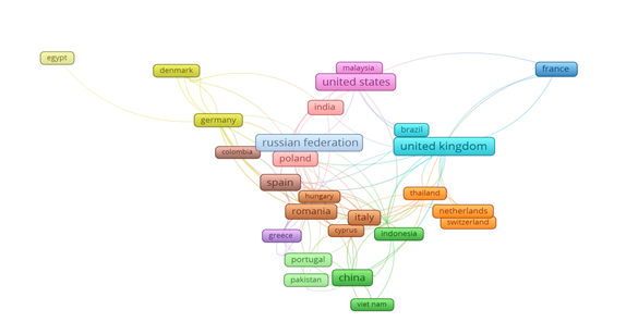 Para describir las interacciones entre los autores, se consideró pertinente realizar una red de colaboración autoral por países. Para ello, se tuvo en cuenta como datos: El número mínimo de documentos publicado por país igual a uno, y el número mínimo de citaciones igual a uno, resultando 75 países.