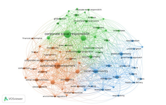 En el análisis de coocurrencia de palabras clave, se aprecian tres clústers o comunidades: Clúster identificado por el término desarrollo sostenible con un total de 26 palabras clave, clúster liderado por el término responsabilidad social corporativa con 25 palabras clave, y el clúster identificado por el término responsabilidad social con 19 palabras clave. Cada clúster se relaciona al interior con otro grupo de términos, lo que conduce a pensar que existen tres grandes frentes de investigación que mantienen fuerte relación al interior de cada uno de ellos, mostrando que las tendencias de investigación están en estos ámbitos.