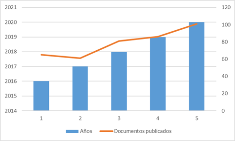 Según se puede apreciar en el Gráfico I, existe una tendencia a un incremento en la producción de documentos sobre procesos de responsabilidad social en la economía social. En el año 2016 se produjeron 61 documentos, y en el 2020 la cifra se incrementó hasta 101.