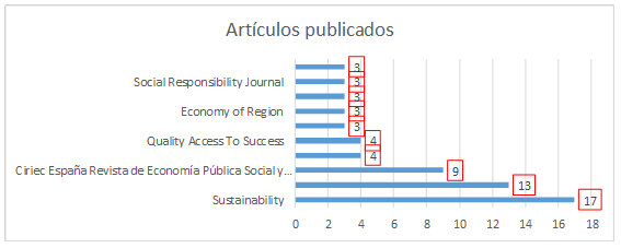 Para determinar el núcleo de revistas con mayor representatividad en el tema procesos de responsabilidad social en la economía social, se aplicó la Ley de Bradford. Del total de artículos igual a 267, publicados en un total de 160 revistas, se identificaron 10 revistas como las más productivas, considerando 3 artículos o más, publicados en el período 2016-2020. Tal como se aprecia en el Gráfico II, estas revistas concentran 53 artículos (19,81%) del total de artículos publicados: Sustainability con 17 artículos publicados (6,36%), Journal of Cleaner Production con 13 artículos (4,86%); Ciriec España Revista de Economía Pública Social y Cooperativa con 9 artículos (3,37%); Journal of Business Ethics y Quality Access To Success con 4 artículos (1,49%) cada una; y Benchmarking y Economy of Region con 3 artículos (1,12%) cada una.