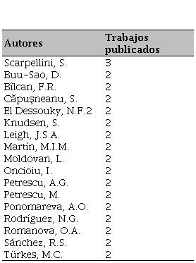 Este indicador permite conocer cuáles son los investigadores que más publican sobre una determinada temática, constituyendo una fuente de información importante para las personas que desean realizar investigaciones dentro del campo del conocimiento. Los autores identificados en un determinado período muestran sus aportaciones que sirven de antecedentes para la elaboración del estado del arte de otras investigaciones, por ello constituyen fuente obligada de revisión.