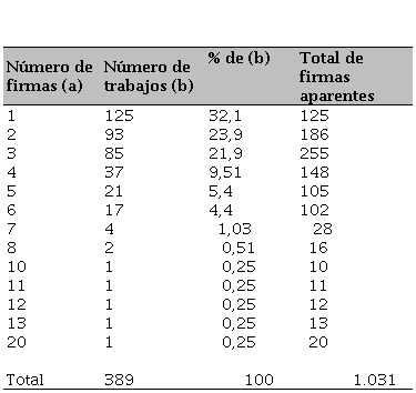 El trabajo en colaboración forma parte de las comunidades de científicos quienes piensan que es necesario compartir criterios sobre un mismo fenómeno objeto de estudio, visiones que pueden resultar enriquecedoras para el progreso científico de determinada área del conocimiento. Este indicador, conocido como índice de cooperación o número de firmas/trabajo, obtuvo un valor de 2,7 firmas o autores/trabajo; resultado obtenido de la división del número de firmas aparentes (1.031) entre el número de trabajos (389). Para el cálculo del indicador se consideró el total de autores y coautores que participan en las 389 publicaciones, independientemente de la posición que ocupen en el documento, identificándose 1.031 autores y coautores.