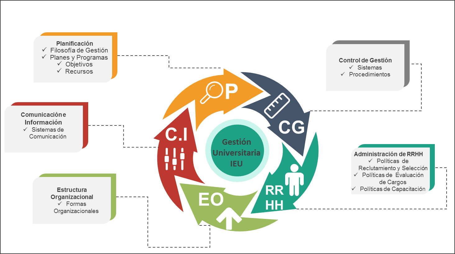 En concordancia a lo previamente expuesto, se desarrolló el objetivo de esta investigación, enfocado en describir los Procesos de Gestión en Instituciones de Educación Universitaria (IEU) Experimentales. Además, se tendrán como referente las dimensiones de los subsistemas que integran la gestión: Planificación, control, administración de recursos humanos, comunicación e información, y estructura organizacional (ver Figura I). Estos componentes delimitan la investigación a la gestión formal en estas instituciones.