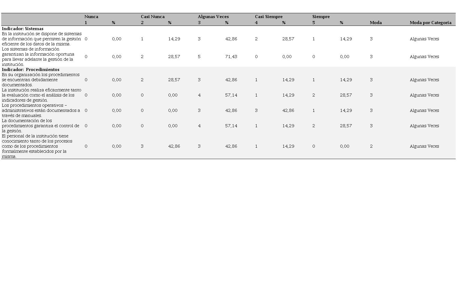 Ahora bien, en relación con los procedimientos, este indicador presenta un comportamiento similar a las respuestas otorgadas anteriormente a los sistemas (algunas veces), en los procedimientos con porcentajes superiores al 42,86%, este renglón se refiere al uso de manuales, empleo de la documentación como herramienta de control, conocimiento tanto de procesos como de procedimientos. Con respecto a este diagnóstico, se logra identificar una deficiencia importante puesto que el conocimiento por parte del personal de los procesos y procedimientos, es un elemento clave para la ejecución eficiente de los mismos, al igual que influye de manera directa si se requiere normalizarlos.