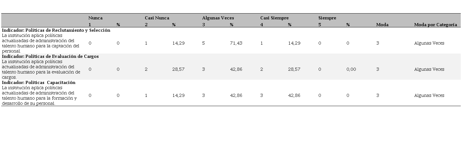 En la presente investigación a criterio de los encuestados (ver Tabla 3), en la institución algunas veces se aplican políticas actualizadas de administración del talento humano, esto referente a su captación (71,43%), y evaluación de cargos (42,86%); mientras que, en relación con su formación y desarrollo, la tendencia oscila entre algunas veces (42,86%) y casi siempre (42,86%).