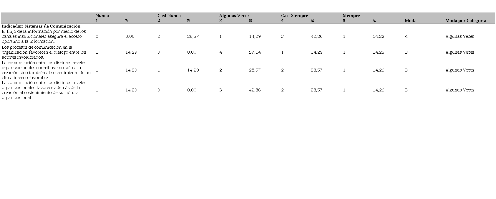 En consideración con la comunicación e información, de acuerdo con los datos suministrados por los consultados, los canales institucionales casi siempre (42,86%) aseguran el acceso oportuno a la información, lo que le imprime un carácter formal a la comunicación. Asimismo, los procesos de comunicación favorecen algunas veces (57,14%) el diálogo entre los actores involucrados y esto se relaciona positivamente con el clima interno, así como la cultura reinante en los niveles organizacionales (ver Tabla 4).