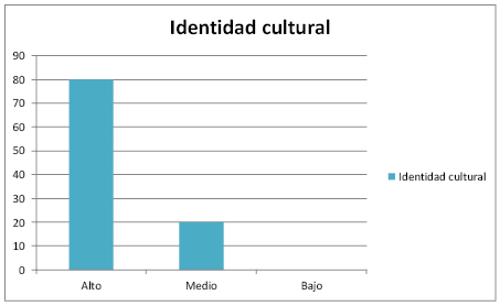 Según la Figura I, se observa que el nivel de identidad cultural en la mayoría de los infantes de 4 y 5 años en Lurigancho-Perú, es alto con 80%, y en la minoría es medio con 20%. De acuerdo a estos resultados es evidente que los infantes antes de la pandemia con frecuencia solían disfrutar de un plato típico de Lima y otras regiones del Perú, como el ceviche, lomo saltado, los juanes, arroz con leche, la chicha morada, la chicha de jora, entre otros; así como de bailar las danzas en el aula como, por ejemplo, el vals, la marinera, el huayno, la cumbia, entre otros.