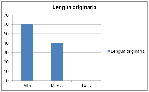 Con relación a la dimensión lengua de origen, se encontró que el nivel es alto en los infantes de 4 y 5 años encuestados en dicha Institución. De igual forma, con esta evidencia, se puede afirmar que todos los infantes hablan español que representa al idioma oficial del Perú, así como gran parte de ellos reconocen que sus progenitores hablan otro idioma originario; lo cual indica que los infantes tienen una adecuada formación en lengua de origen.