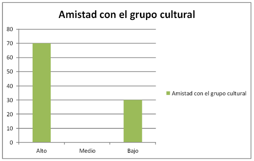 De igual manera, con respecto a las relaciones de amistad con el grupo cultural, según se aprecia en la Figura III, el nivel es alto con un 70%, y un nivel bajo con 30%. Acorde a los resultados, es evidente que los infantes antes de la pandemia con frecuencia fueron llevados por sus padres a fiestas costumbristas o reuniones vecinales en donde se suele bailar o disfrutar de música de sus lugares de nacimiento, pero también hay de los infantes que suelen quedarse en casa cuyos padres están muy ocupados en su trabajo que nunca salen a una reunión costumbrista.