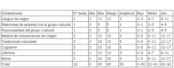 a. Aspectos externos: 1. Lengua de origen, con dos indicadores: a) Conocimiento y nivel de expresión con la lengua de origen, b) Contextos en los que se utiliza la lengua de origen; 2. Relaciones con miembros del grupo cultural, con un indicador: a) Amigos que se tienen dentro y fuera del grupo cultural y afinidad con ellos; 3. Funcionalidad del grupo cultural, con un indicador: a) Participación en las actividades del grupo; 4. Medios de comunicación de origen, con tres indicadores: a) Radio, b) Programas de televisión, c) Periódicos; y, 5. Tradiciones culturales, con tres indicadores: a) Comidas típicas, b) Celebración de fiestas tradicionales, c) Realización de prácticas religiosas y Componentes de costumbres.