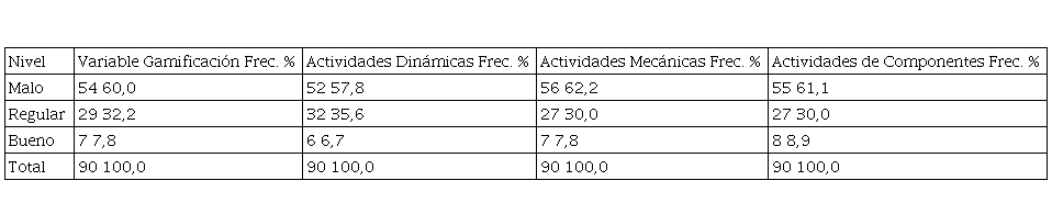 De acuerdo con el análisis de la Tabla 1, se observó que, de los 90 estudiantes de primaria en tiempos de pandemia, en San Martin de Porres, el 60% (54 estudiantes) percibieron la gamificación en un nivel malo; mientras que el 32,2% (29 estudiantes) la apreciaron con un nivel regular; y el 7,8% (7 estudiantes) la observaron con un nivel bueno.