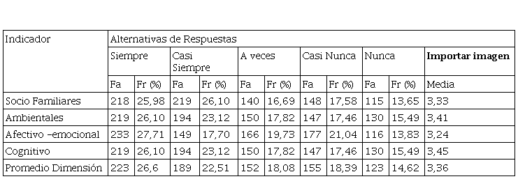 Como resultado final de la dimensión, Factores influyentes del estrés académico, se observa que el 26,6% de los estudiantes encuestados siempre cumplen con los indicadores para esta dimensión; el 22,51% se ubicó en la opción casi siempre se cumplen; el 18,08% opina que algunas veces; el 18,39% afirman que casi nunca; y, por último, el 14,62% se inclinó por la opción nunca (ver Tabla 1). No obstante, se muestra que, en las respuestas de los estudiantes, en cuanto a los factores generadores de estrés académico se ubicó en una categoría de “Moderada presencia” en el valor de la media aritmética de 3,36; infiriéndose de este resultado que los alumnos en estudio, muestran que están relacionados los factores socio-familiares, ambientales, afectivo-emocional y cognitivo con el estrés.