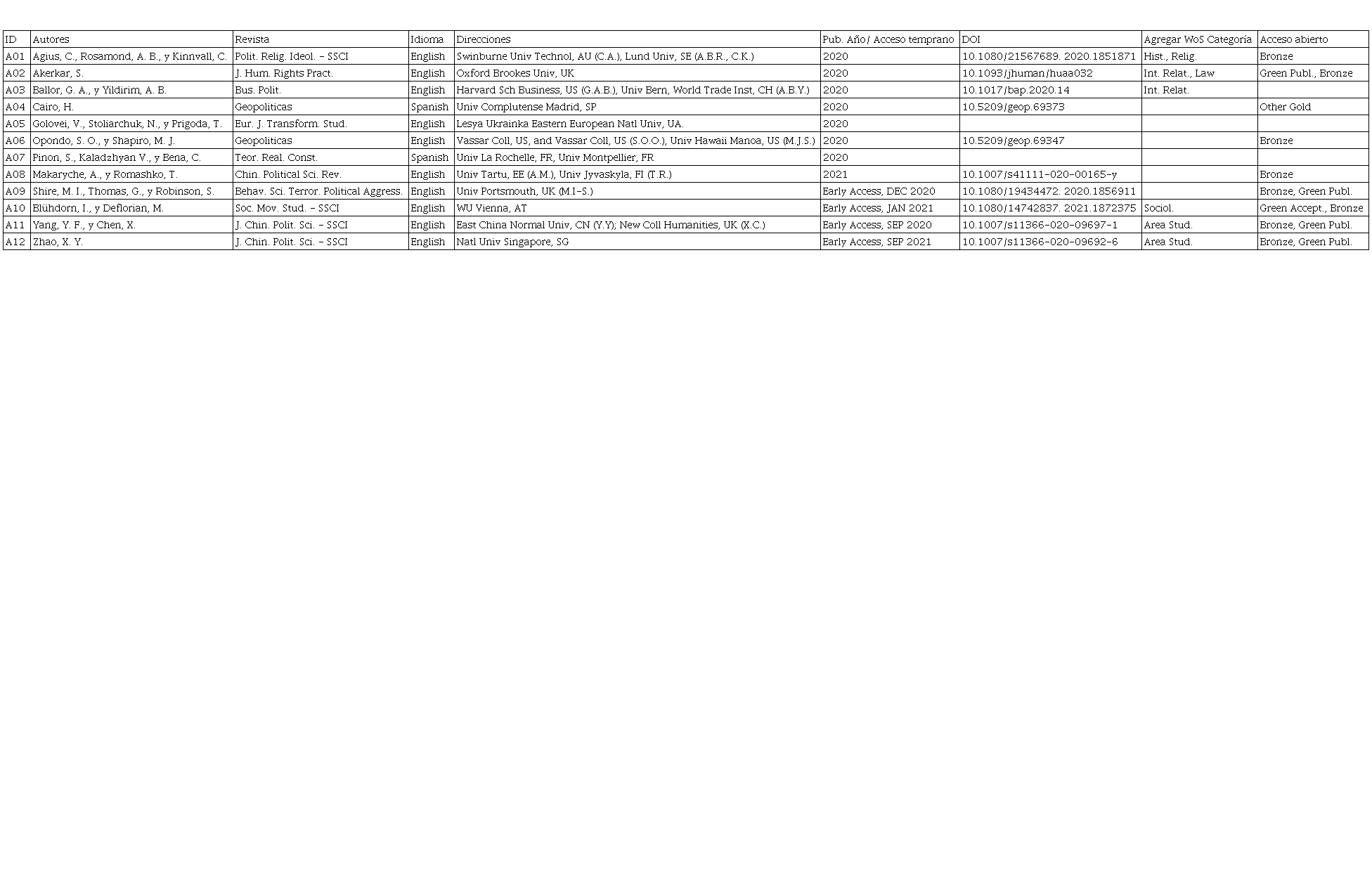 Luego, ESCI aporta artículos publicados en revistas sin cálculo de impacto pero agrega otras publicaciones originadas en regiones donde la producción de conocimiento se desarrolla con menor intensidad y se reconoce dentro de la periferia y semiperiferia de la producción de conocimiento (Oliveira et al., 2019); finalmente, la base de datos de Actas de Congresos (CPCI-SSH) aporta conocimiento reciente que aún no ha sido publicado en revistas, pero que ya forma parte de la discusión en prestigiosos congresos internacionales.