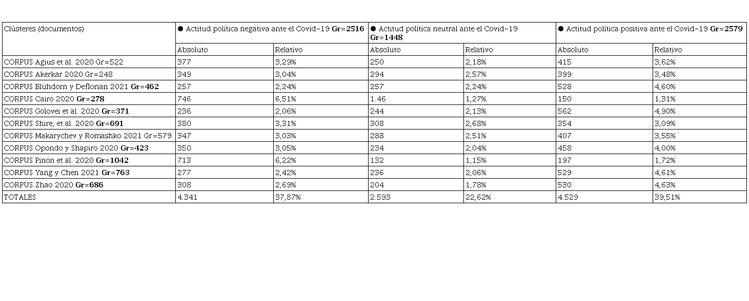Hay datos muy relevantes en los hallazgos de esta investigación, puesto que se identificaron 12 artículos, producidos con la contribución de 21 autores afiliados a 21 organizaciones ubicadas en 13 países, trabajos relacionados que acompañan a este proceso de investigación, con los que se puede evidenciar que estos autores desde su sapiencia, muestran una actitud positiva, neutra o negativa con respecto a los discursos políticos en torno al Covid-19.
