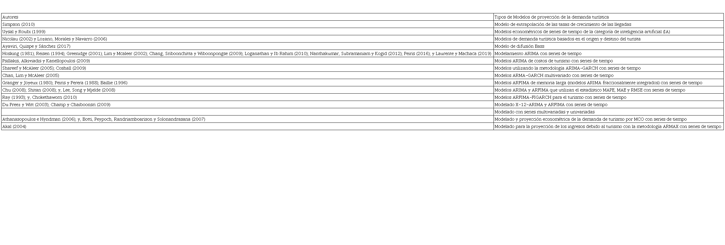 Para una eficaz planificación de las actividades en el turismo y una acertada toma de decisiones, es necesario apoyarse en los estudios de La Serna (2012), puesto que se requiere conocer la proyección de la demanda turística para lograr una estimación apropiada, lo que implica considerar factores externos como la globalización, las crisis económicas, las innovaciones de la informática y las comunicaciones, fenómenos naturales, epidemias, acciones de la competencia, además de incluir factores en los que el destino tiene posibilidad de accionar. En ese sentido, los modelos de proyección de la demanda se basan en métodos cualitativos, así como cuantitativos, a continuación, se muestra en el Cuadro 2 propuestas de modelos de algunos autores.