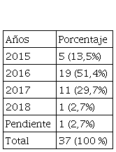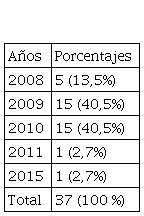 Del análisis de los datos de la investigación realizada, se evidencia que en 2008 la titulación se implanta en las Universidades de Zaragoza y “Pontificia Comillas” de Madrid; y en el período 2009-2011, 35 universidades (92%) lo ponen en marcha; observándose que las universidades implantan los estudios previa evaluación y verificación. Como señala la siguiente Tabla 1, 30 universidades (80,1%) disponen de verificación en el periodo 2009 (15) - 2010 (15); 5 en 2008; y 2 en 2011 (1) y 2015 (1).