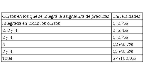 En relación a la integración en el itinerario formativo donde se imparte las asignaturas, tal y como muestra la Tabla 3, mayoritariamente se integran en 4º curso, 18 universidades (48,7%); seguido de aquellas que lo hacen en dos cursos, 15 en 3º y 4ª (40,5%) y 1 en 2º y 4º. Finalmente, 2 en tres cursos (2º, 3º y 4ª) y 1 en todos los cursos. Por tanto, 33 universidades (89,2%) ubican la/s asignaturas en el segundo ciclo del grado y todas disponen de asignaturas relacionadas con las de 4ª curso.