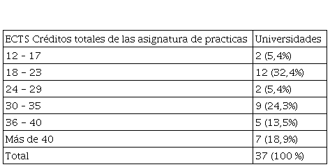 Tras el análisis de las asignaturas de la titulación en las diferentes universidades a través de las guías docentes, se constata que en las 37 (100%) universidades donde se imparte el titulo se ofrece la asignatura relacionada con prácticas en organizaciones y entidades sociales, la misma tiene diferentes denominaciones. Unas adoptan nombres genéricos (“prácticum”, “prácticas”, “prácticas externas”); otras aluden a niveles de progresión del conocimiento (prácticas profesionales/practicum I, II, III), algunas presentan denominaciones específicas relacionadas con el proceso metodológico (“prácticas externas de investigación”, “prácticas externas de intervención”, “prácticas de estudio diagnóstico”, “prácticas de intervención social”, “prácticas de análisis de la realidad”, entre otros); y otras combinan varias categorías (“prácticas I generalista”, “prácticas II especializado”, “prácticum III: Contextos de intervención social”, “prácticum VI: Prácticas de acción social y supervisión”, entre otros).