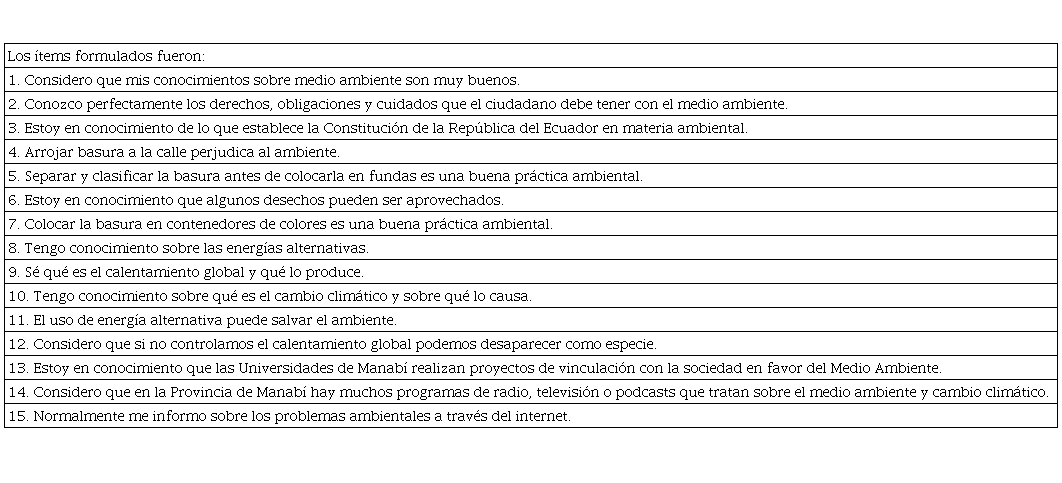 El cuestionario estuvo conformado por 15 ítems en escala de Likert de los cuales 7 están relacionados con el medio ambiente, 5 con el cambio climático, 1 concerniente a las actividades de vinculación realizadas por las universidades, y 2 sobre los podcasts. La escala utilizada fue 1=Totalmente en desacuerdo, 2=En desacuerdo, 3=Ni de acuerdo ni en desacuerdo, 4=De acuerdo, 5= Totalmente de acuerdo. La confiabilidad del cuestionaario fue medida con el coeficiente