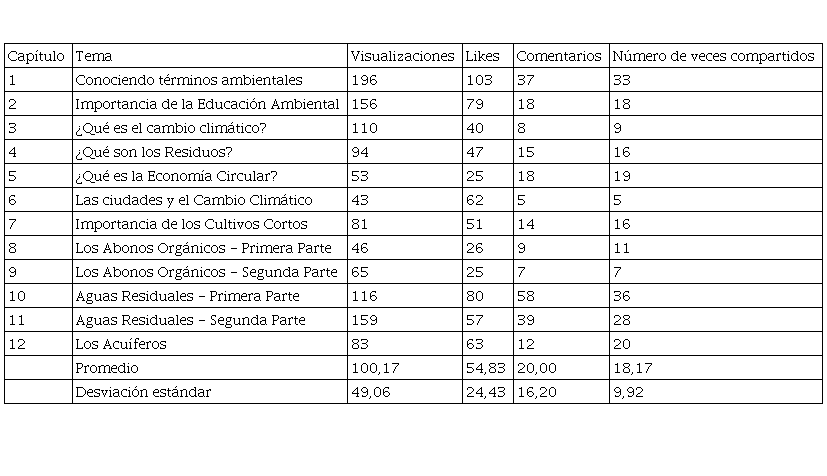 En la Tabla 2, se muestran los resultados obtenidos en los 12 programas preparados para informar a la comunidad sobre temas ambientales. Como puede observarse, los programas “Conociendo términos ambientales”, “Importancia de la Educación Ambiental”, “¿Qué es el cambio climático?”, y “Aguas Residuales”, fueron los programas con mayor audiencia. El primero de ellos, “Conociendo términos ambientales”, fue el de la más alta audiencia, con más likes (me gusta), y el segundo con más veces compartido. Esto fue debido, probablemente, a la novedad del programa y al interés suscitado en la audiencia por conocer sobre el lenguaje utilizado en los temas ambientales.
