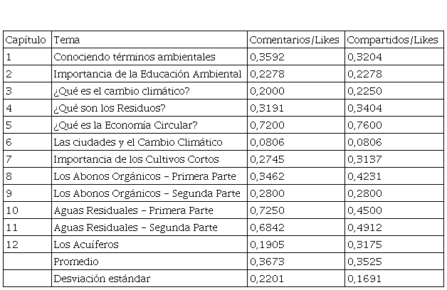El análisis estadístico aplicado a los programas mostró que la relación entre los likes, comentarios y compartidos refleja la importancia de la educación ambiental para la población. La prueba de hipótesis evidenció que los temas tratados que tengan likes y comentarios, también serán compartidos. Esto demostraría que el interés manifestado por los oyentes es transmitido también a otros, indicando una actitud positiva hacia la problemática ambiental, lo que podría traducirse en un cambio de actitud o comportamiento proambiental.