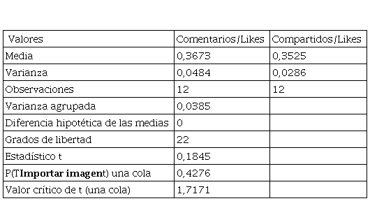 En la Tabla 3, se muestra la relación entre los comentarios hechos para un programa particular que recibió likes y los mismos programas que fueron compartidos por la audiencia. Se puede comprobar estadísticamente si aquellos programas que reciben likes y son comentados también serán compartidos. Esto podría hacerse determinando si hay diferencia significativa entre los valores medios observados en las relaciones Comentarios/Likes y Compartidos/Likes.