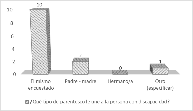 Como segunda instancia del trabajo desarrollado, se aplicó una encuesta a 13 personas para conocer la inclusión laboral de las personas con discapacidad, obteniendo los resultados que se presentan a continuación. Para ello, se indagó sobre el tipo de parentesco con la persona con discapacidad, la condición y situación socioeconómica, la experiencia en emprendimientos y habilidades personales para emprender. En el Gráfico I, se identifica la relación del entrevistado con la Fundación, observando que 10 son la misma persona con discapacidad, 2 son madre o padre de la persona con discapacidad, y 1 es otro.
