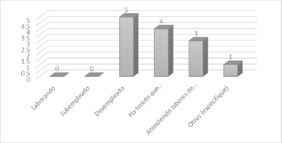 En el Gráfico II, se observa la condición laboral de los encuestados, confirmando que una gran proporción de ellos (38%) se encuentran desempleados. De un total de 13 encuestados, 5 están en la condición de desempleados; 4 se encuentran emprendiendo algún tipo de actividad que le permita generar ingresos y poder sostenerse; otros 3 se encuentran realizando labores de casa; y 1 sola persona se dedica a otras actividades.