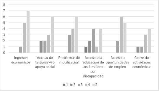 En el Gráfico III, se presenta la situación socioeconómica que se enfrenta en el hogar de los encuestados, la cual también como consecuencia de la pandemia ocasionada por el COVID-19, ha impactado de forma desfavorable en diversas variables, entre ellas la disminución de los ingresos económicos; las dificultades para el acceso a terapias y apoyo social; los problemas de movilización; el acceso a la educación y oportunidades de empleo; así como el cierre de actividades económicas.
