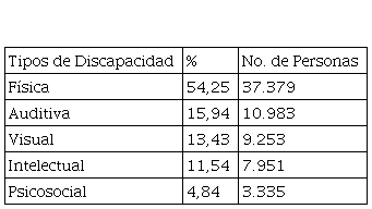 Según el Consejo Nacional para la Igualdad de Discapacidades (CONADIS, 2022), los tipos de discapacidad que se presentan van desde la discapacidad física, auditiva, visual, intelectual hasta psicosocial. El total de personas con discapacidad activas laboralmente, para enero del 2022, es de 68.901 de un total de 470.820 registradas y el porcentaje con las distintas discapacidades son las que se muestran en la Tabla 1.