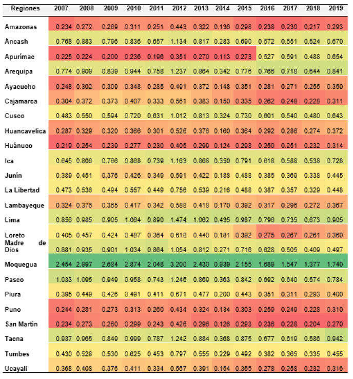 También se muestra que las tasas de crecimiento fueron bajas, no habiendo una penetración de las políticas públicas que contribuyan a optimizarlas, con excepción de la región Apurímac y Arequipa, coincidiendo con lo encontrado por Cabrera (2002); así como por Delgado y Rodríguez (2014).