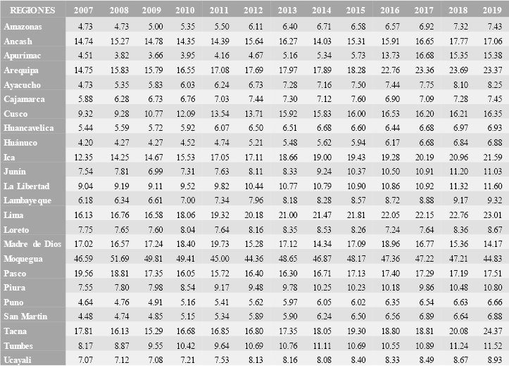 Analizando el PIBPC regional, se observa que las disparidades aumentan considerablemente, concentrándose el crecimiento económico principalmente en la actividad minera, turísticas, y territorialmente en Lima (ver Tabla 2).
