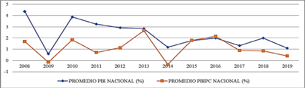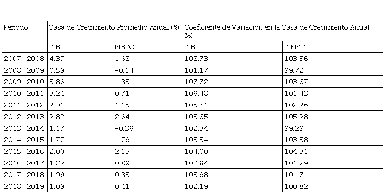 Estas brechas entre el crecimiento económico y el de su población se muestran en el Gráfico I, donde la diferencia entre las dos curvas exhibe, con excepción del año 2013, 2015 y 2016, que el desempeño no influyó sobre su población y, luego de haber alcanzado un máximo en el año 2016 retroceden. En resumen, solo tres años de los doce a los que se circunscribe el estudio; el PIBPC (promedio) superó al promedio del PIB, lo cual indica que los logros obtenidos en el crecimiento no penetran en la pobreza estructural y la disparidad del país, diluyendo el esfuerzo realizado en el periodo.