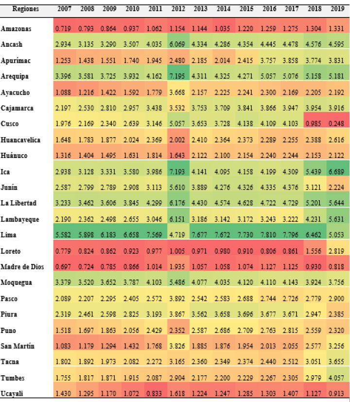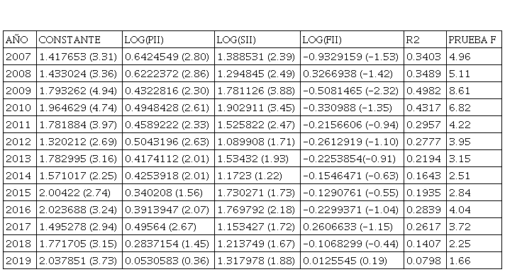 Asimismo, Cabrera (2002); y, Delgado y Rodríguez (2014), recalcan la importancia de los niveles de ingresos en la calidad del capital humano y físico de un país; lo que coincide con la investigación desarrollada, al encontrar una relación entre los índices y el ingreso. Además, el presente estudio se enfoca en el mediano plazo y el análisis de los índices PII, SII, FII, y FDI, que en el caso de Del gado y Rodríguez (2014)(4) estaba basado en el largo plazo y solo abordan algunos aspectos que construyen el PII y SII, a través de la medición del índice de alfabetización con el que incorporan el progreso tecnológico a su modelo, lo que aun cuando las regiones con mayor crecimiento parecen concentrar mayor progreso tecnológico, no queda de todo claro la existencia de barreras que impidan la rápida adopción de estas tecnologías, más aun cuando la distancia física es reducida.