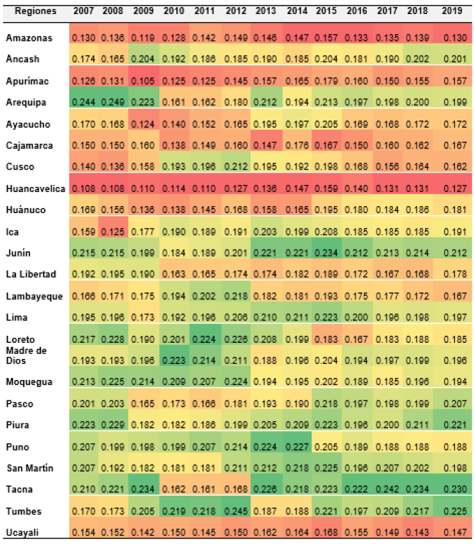 Dado los hallazgos encontrados en la investigación, se observa que las disparidades entre las regiones aumentan de forma considerable. El crecimiento económico se centraliza, principalmente, en las dedicadas a la minería, seguidas por Lima y las destinadas al turismo. En el análisis de la variación en el tiempo del PIBPC en cada región, se percibe que no existe una recuperación en las rezagadas; los resultados coinciden con los encontrados por Gallo et al. (2015), cuando afirma que el crecimiento económico peruano “convive con la desigualdad y la divergencia regional”. Además, la desigual integración física, económica y estatal de las economías regionales, contribuye a perpetuar dichas disparidades.