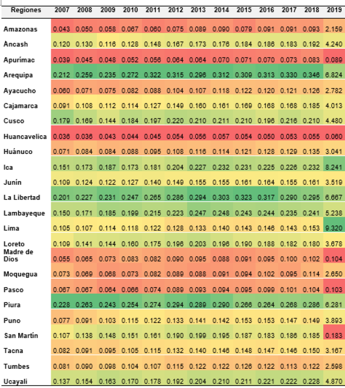 En este sentido, se utilizan datos que cubren el período 2007 – 2019 y que evalúan el desempeño económico en veinticuatro regiones del Perú(1); examinando las divergencias regionales en el ingreso per cápita, centrándose principalmente en un riguroso análisis regional de causas y evaluando la convergencia estocástica con el objetivo de clasificar a las regiones en convergentes y no convergentes en los niveles agregados y sectoriales.