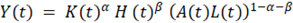 Donde Y, K, H y L son producción, capital físico, capital humano, y trabajadores, respectivamente, α es la elasticidad parcial de la producción con respecto al capital físico, β es la elasticidad parcial de la producción con respecto al capital humano y A(t) es el nivel de eficiencia económico y tecnológico. Se puede asumir que este nivel de eficiencia, A(t), tiene dos componentes: La eficiencia económica I(t) la cual depende de las instituciones y políticas económicas, y el nivel de progreso tecnológico Ω(t), como en Cellini (1997). Así, I(t), puede ser escrito como una función logarítmica lineal de las variables institucionales y de políticas económicas, mientras que Ω(t) se asume crece a una tasa g(t).