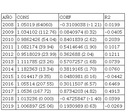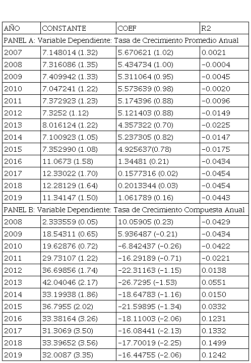Se refiere a la movilidad de diferentes regiones en términos de PIBPC en el tiempo, y se mantiene si las inicialmente más pobres crecen más rápido que las ricas. En la Tabla 4 se observa la convergencia del PIBPC por cada año de estudio.