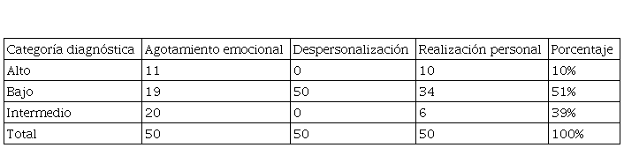 La variable Síndrome de Burnout se midió mediante el Inventario de Maslach Burnout, llegando a determinar en primera instancia las categorías diagnósticas presentadas, según su frecuencia en la población. En la Tabla 1, se visualiza cómo ha sido la dinámica de distribución de la variable Síndrome de Burnout en la población evaluada, logrando ver las diferentes categorías diagnósticas alcanzadas. Se destaca que el 51% del total de la población, ha alcanzado un nivel diagnóstico bajo en las tres categorías; seguido del 39% que alcanza un nivel intermedio; finalizando con que solo un 10% de la población evaluada alcanza un nivel diagnóstico alto.