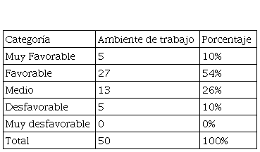 Por su parte, la variable Ambiente de trabajo se midió mediante el cuestionario, llegando a determinar en primera instancia las categorías diagnósticas presentadas, según su frecuencia en la población. En la Tabla 2, se puede observar a nivel general que el mayor porcentaje (54%) de la población ha alcanzado un nivel favorable, seguido de un 26% con el nivel medio, y un 10% entre los niveles muy favorable y desfavorable, destacando el hecho que ningún porcentaje de la población alcanza un nivel desfavorable, lo cual significa que la gran mayoría de los participantes evaluados perciben su ambiente de trabajo como agradable y satisfactorio.