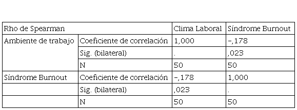 En la Tabla 3, se evidencia que, al correlacionar la variable del Síndrome de Burnout con el clima laboral, se puede ver que de acuerdo a la Correlación de Rho de Spearman que alcanza el valor de - 0,178 la correlación se encuentra en la escala negativa, por lo cual se puede afirmar que existe correlación negativa pero débil. Esto significa que mientras menores son las condiciones del ambiente de trabajo, mayor presencia de Síndrome de Burnout.